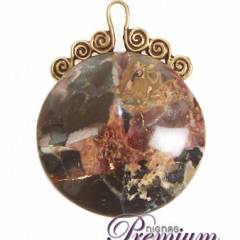 Dendrites Agate Brooch dengan material dasar berupa batu akik, dilapisi denganlempengan tembaga dan ornamen dari batu alam. Diameter : 6 cm